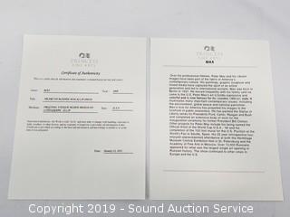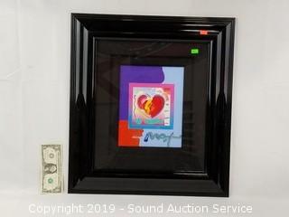 Discription: Titled "Heart on Blends". Mixed media on lithograph-A/L/P. Purchased from Princess Fine Arts. Comes with COA, artist information. We have the original purchase receipt of $958. Black lacquered frame with fabric matting and acrylic cover. Overall approx. 19-1/4" x 21-1/4".