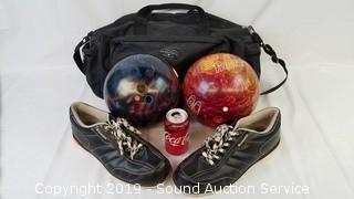 Discription: Includes: Ebonite Made in USA Bowling Ball, and BVP Brunswick Bowling Ball, Athletic Bag, and Brunswick Size 12 Shoes.