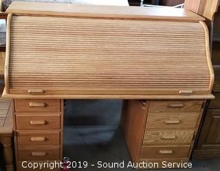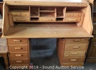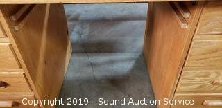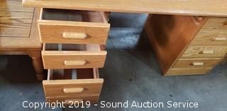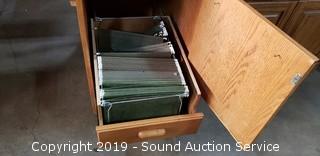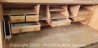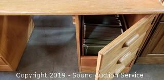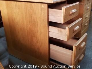 Discription: Some wear to the finish, almost gives it a whitewash look. Comes in 3 pieces. File drawer comes full of file folders. Overall approx. 50" H, 5ft L, 30" D.