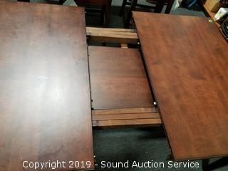 By Intercon Furniture. Some dings on one of the corners of the table, one of the chairs has a scuff. Approx. 30" H x 42 x 54" - 72" with leaf. Chairs are 37.5" T x 18.5" wide seat.