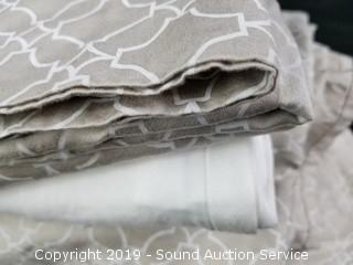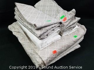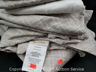 Like new. 1 flat sheet, 1 fitted sheet, 2 printed pillow cases and 2 solid pillow cases.