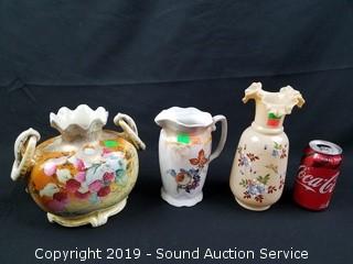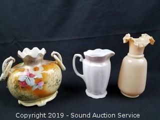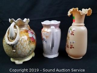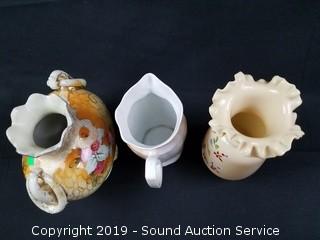 Lot #0042: 3 Vtg. Hand Painted Vases & Pitcher