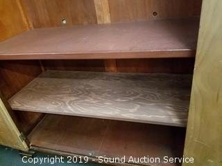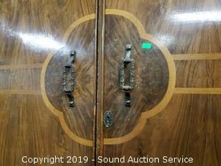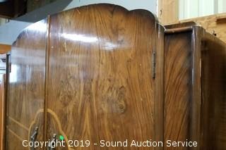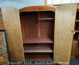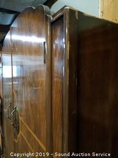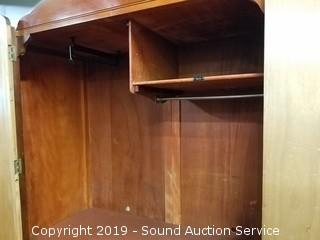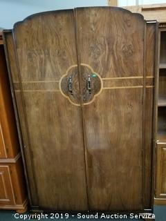 Approx. 77" H x 48" x 21". Has Rods for hanging clothes. Some wear to the finish. Skeleton key lock **NO KEY**.