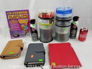 Includes approx. 100+ CD-Rs and 100+ DVD-Rs, planners (like new), (2) 10oz containers can air, Targus tablet cover (fix approx. 9" x 7" tablet) and CD Jewel Case Insert refills.