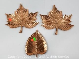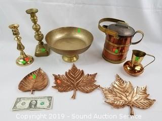 Includes brass compote (possibly hand hammered), 3 solid copper leaf plate decor, brass and copper pitchers and copper candle stick holder.
