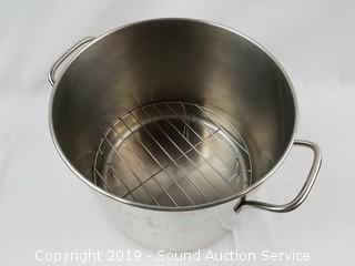 Stock pot has a raised wire rack.