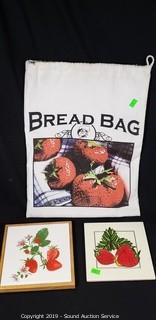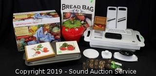 Includes spiral vegetable slicer, strawberry print trivets and cookie jar, coasters, covered baking pans and mandolin.