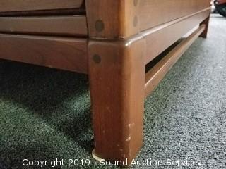 In excellent condition. Has a few minor scuffs to the finish. 40" x 40" table top, 18.5" high, 38.5" wide. Has 3 drawers (top drawer is felt lined) that open on either side of the table. Locking, comes with 2 keys.