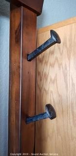 Has storage in the seat and railroad spikes for hooks. 77" T x 37" W x 16" D.