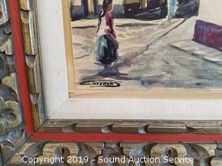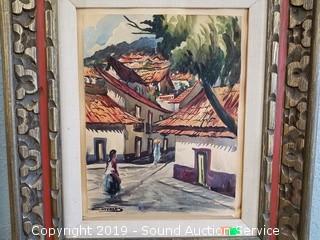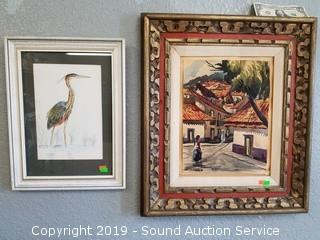 Watercolor is signed Cervantes, do not see a signature on the crane. 22" x 19" and 12" x 16" overall.