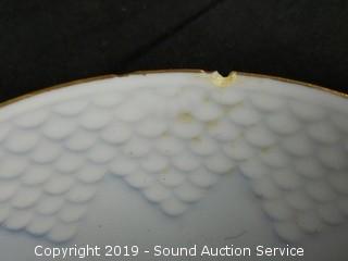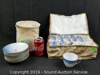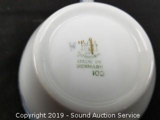 Item Description: Includes: 9 Cups, 10 Saucers (one has a chip). Made in Denmark. Seagull print. Comes with padded storage bags.