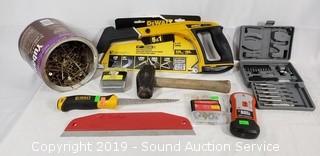 Lot #0382: DeWalt Saws, Mallet, Stud Sensor, Level & Screws