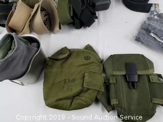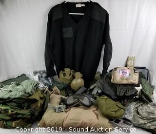 Item Description: Includes: Gun cleaning kits, goggles, caps, hats, belts, care package, canteens, chemical protective gloves, cook pot, balaclavas, flashlight, laundry sack, bags, breathing equipment face piece, decontamination packs and kits, pillow, and more.
