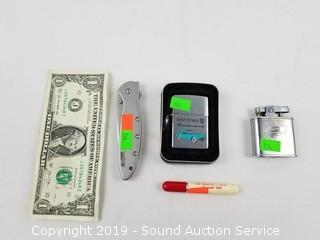 Item Description: Knife is partially serrated and has assisted opening. Zippo is dated 1996. Also comes with Ronson and an advertising pen lighter.