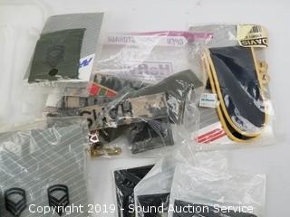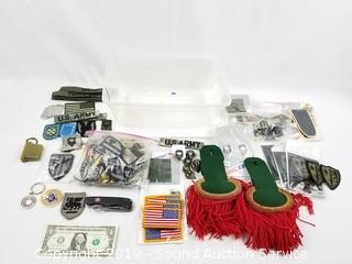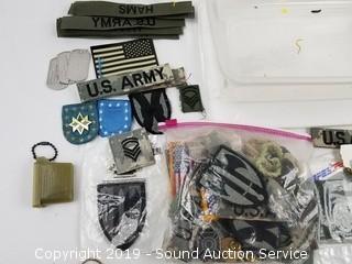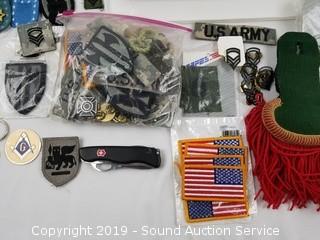 Lot #0219: Tote w/Military Patches Insignias Pins &Multi-Tool