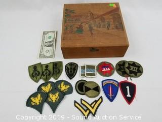 Lot #0362: Wooden Cigar Box w/Various Military Patches