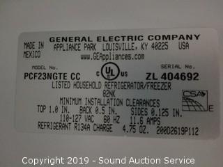 Item Description: Ivory color. Has water and ice dispenser. In good condition. Model PCF23NGTE CC Serial ZL404692. 69.5" T x 35.5" W x 27" D.