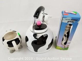 Item Description: You get a whistling tea kettle, mug, timer, salt/pepper shakers, burner covers, pepper mill, and a windmill stake.