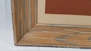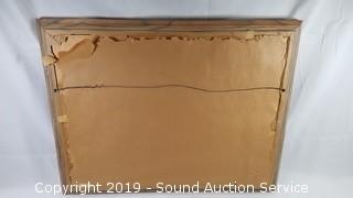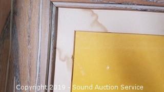 Item Description: Beautiful whitewashed solid wood frame. Matting has a little water stain on it. Art has a couple small nicks. Approx. 21" x 27". Frame fits a 24" x 18" piece of artwork.