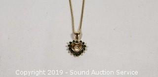 Item Description: Includes a gold tone necklace with heart pendant with green stone settings and two matching earrings and a shell pearl necklace and bracelet set.
