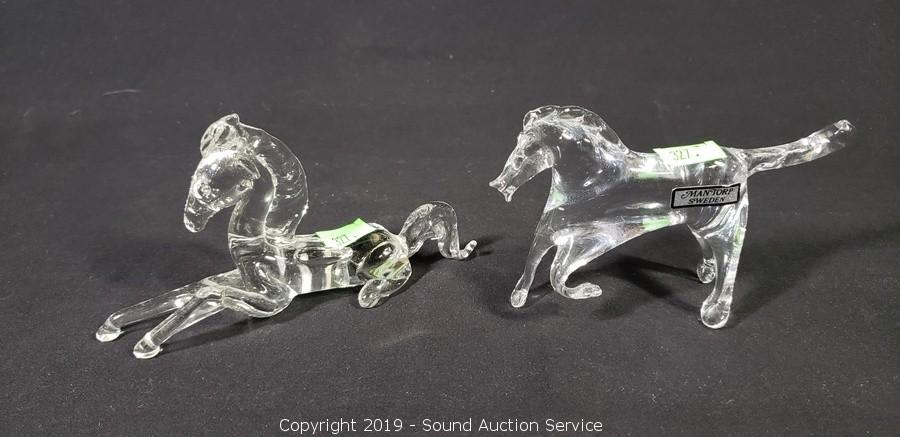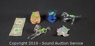 Item Description: Includes a Rinconada bear figure, initialed on the bottom, has a small chip on its foot, two Mantorp Sweden crystal horse figures, a Fenton like art glass mouse and a sea turtle. Tallest is 3.5".