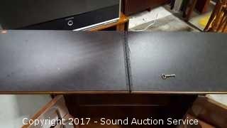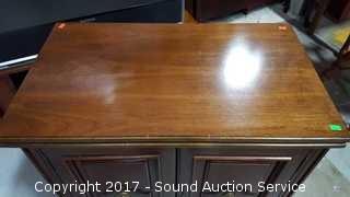 Comes with key. Model B96. On castors, in excellent condition. Made in USA by Dorset Corporation. Top Slides over and flips open. Approx. 34.5" tall, 27.5" wide and 16.5" deep. When open has a 56" top.
