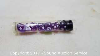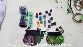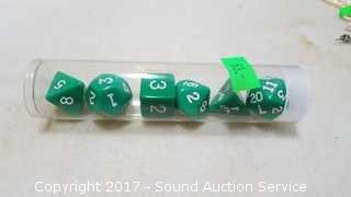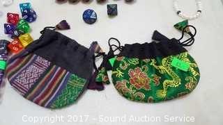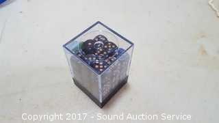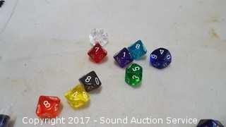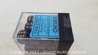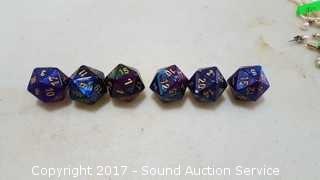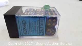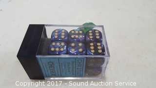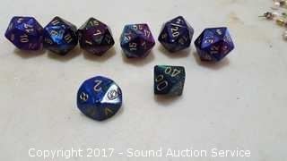 D20, D10, D100, D8, D6, D12, D4. Many are royal blue scarab.