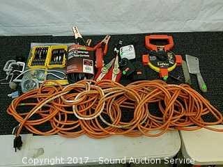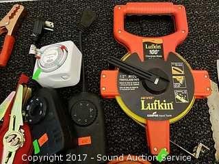 Includes: 100 ft tape, Dewalt bit set, extension cord, timers, jumper cables, straps and more.