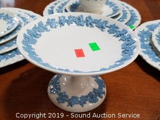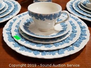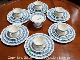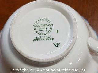 Item Description: Shell Edge. Embossed Queensware. (6) 5 piece place settings: 6 dinner plates, 6 lunch plates, 6 snack plates, 6 saucers, 6 tea cups, and 4" x 6-1/4" compote. Do not notice any chips or cracks. Made in England. Sound Auction will work with buyer to arrange outside shipping.