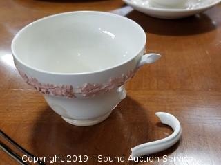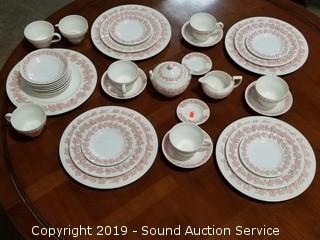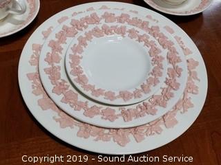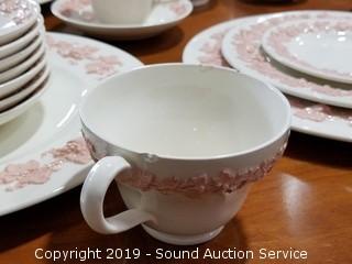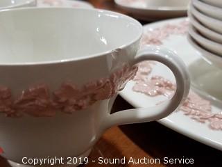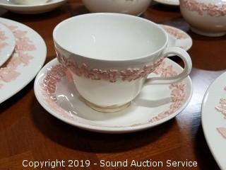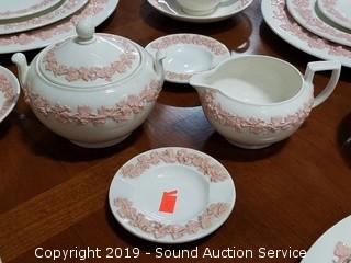 Lot #0005: 35pc. Wedgwood Pink on Cream Embossed Queensware