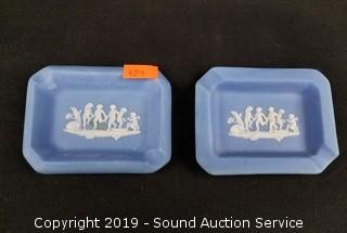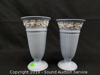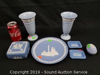 Item Description: All are made in England. Queensware includes (2) 6.5" vases, one has a small chip on the bottom rim, the rest appear to be in excellent condition. The larger Jasperware trinket box is 2" x 4" square.