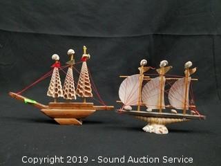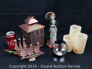Item Description: Includes a lighted lady figure, 2 wood and shell sail ship models, 2 lanterns and 3 candles. All work. Largest lantern is 9" T x 5" square.