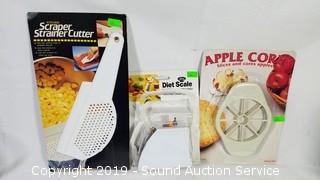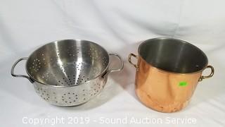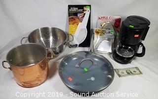 Item Description: Includes stainless strainer, Bonson Kitchen coffee maker, 12" Green Pan skillet, Coporal Portugal copper pot and 3 new in package kitchen gadgets.