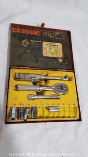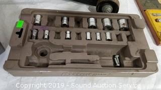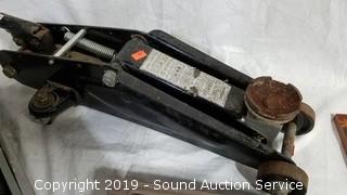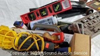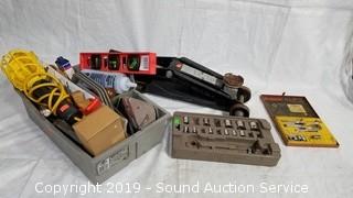 Item Description: Sockets, 12" level, drop light, vise grips, tool tote, and more. Floor jack does not have the bar.
