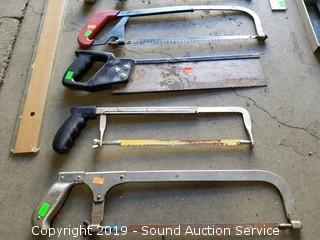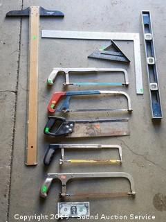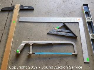 Lot #0219: Hand Saws, Level, Carpenters Square &Straight Edge