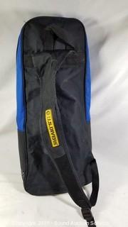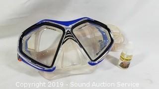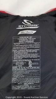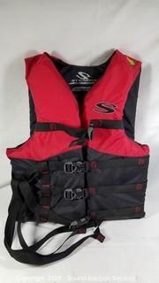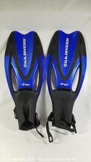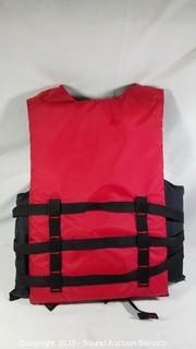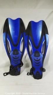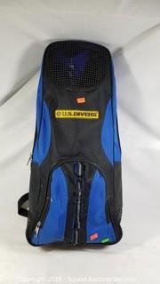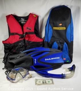 Item Description: Life jacket is adult oversized, 52" to 62". Fins are size large, 10-13. One zipper on the bag is broken off.