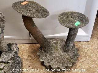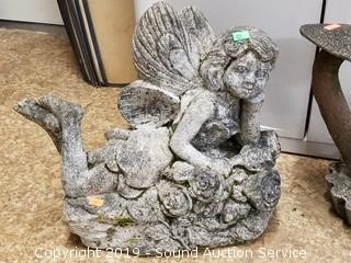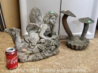 Item Description: Fairy and mushroom. 14" to 11.5" T and 10" to 12".