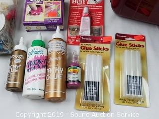 Item Description: Glue guns, glue sticks, paint, colored pencils, 2 totes, one lid & more. Totes are approx. 8" x 13" x 18".
