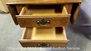 Item Description: Has 2 drawers. Overall good condition. Approx. 21" T x 21" W and 37" W with leaves extended x 25" D. Dovetail construction.