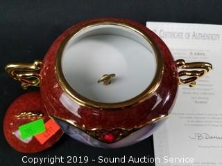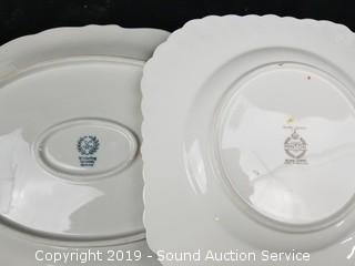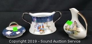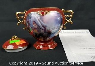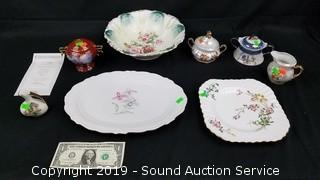 Item Description: One is Thomas Kinkade music box with COA, antique Prussia Rose Bowl, Minton & Winterling plates, mini Alka Kunst pitcher, PM Bavaria sugar dish.