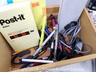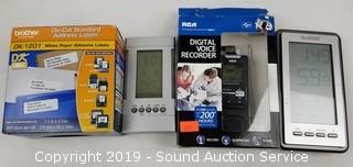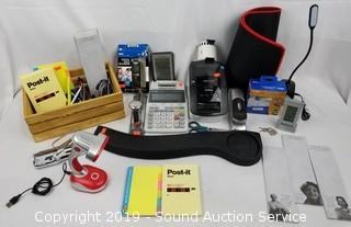 Item Description: Includes calculator, Brother label printer QL-700, electric stapler, Brother labels, desk mat, keyboard wrist pad, La Crosse thermometer clocks, reading lights, note pads and more.