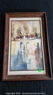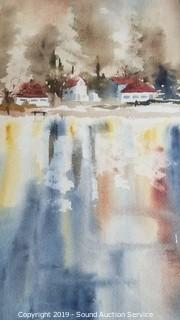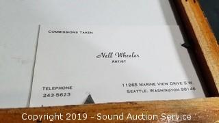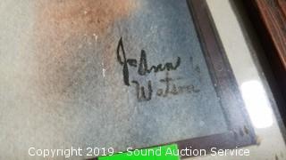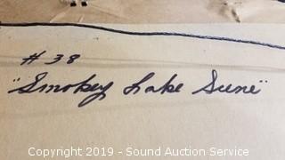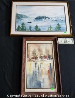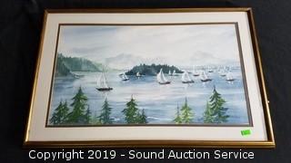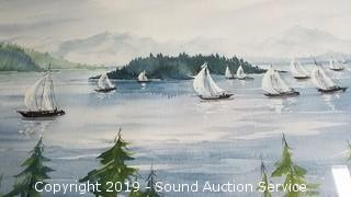 Item Description: Includes Nell Wheeler images of sail ships, 20" x 11.5" image size, overall 24.5" x 16" and Jo Ann Watson titled "Smokey Lake Scene" with a hand crafted wooden frame, 9-1/4" x 15-1/4" image size, frame fits an 18" x 11" piece of artwork. Both are matted with glass.
