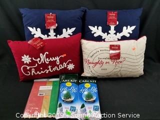 Lot #0386: Christmas Throw Pillows, Tree Care Kits & Tissue
