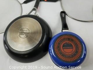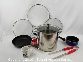 Item Description: Includes 12qt stainless stock pot w/lid, Circulon 10" non-stick pan, 1qt sauce pan, 3 splatter screens & tongs.