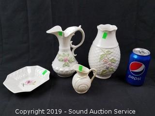 Lot #0191: 4pc Belleek Fine China Pitchers, Vase & Dish