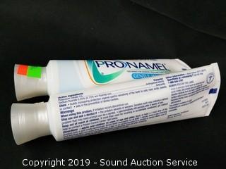 Item Description: Package of toothbrushes has been opened, medium bristles. You get 2 tubes of Sensodyne Pronamel gentle whitening toothpaste.