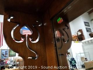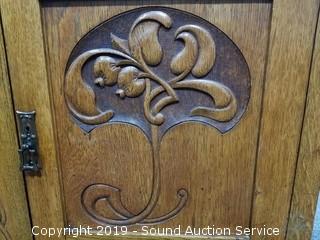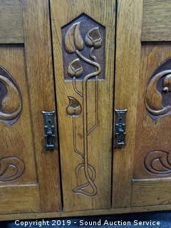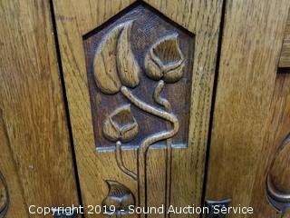 Item Description: Hand carved embossed accents, copper finish hardware, skeleton key locks (no key), dovetail construction, beveled glass mirrored topper. Small gap in the bottom front of each drawer. Approx. 84" H x 54" x 19-1/4".