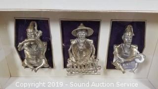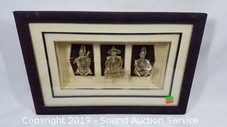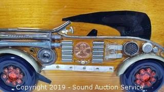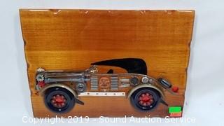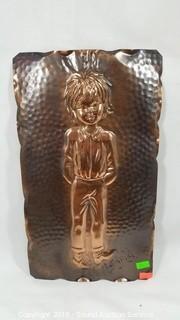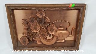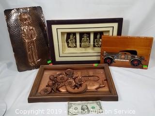 Item Description: Includes hand crafted & signed E. Papini Boy copper sheet artwork, 7-1/2" x 13-1/2". Unique lacquered mosaic vehicle made from various household items, 7-1/2" x 10-1/2". Coppercraft Guild Floral Teapot & melon artwork, 11" x 16". And shadow box brass tribal musician artwork, 10-3/4" x 16".