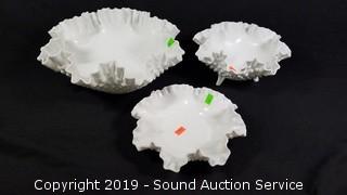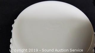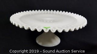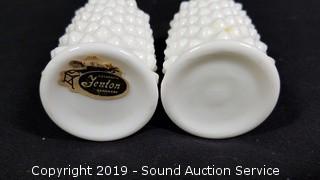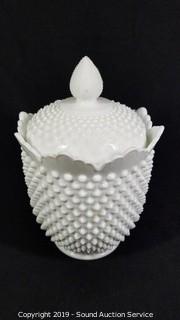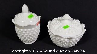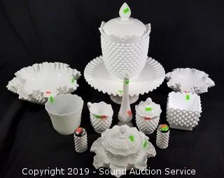 Item Description: Fenton pieces include cake plate, salt and pepper shakers and covered dish. Unmarked dishes includes candy dishes, cream, sugar, vase, 3 ruffled edge hobnail dishes, and cookie jar.