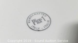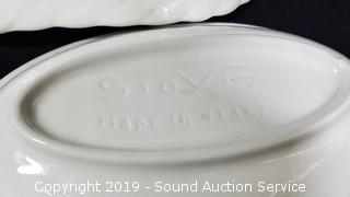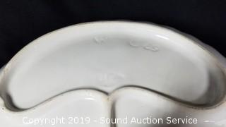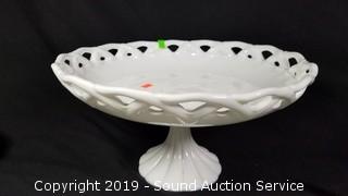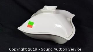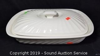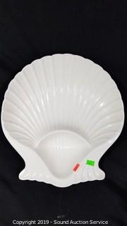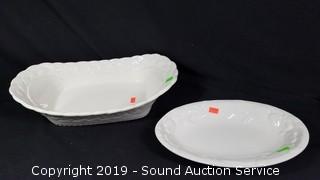 Item Description: Shell chip & dip, scalloped covered casserole dish, lattice handled dishes and compote.